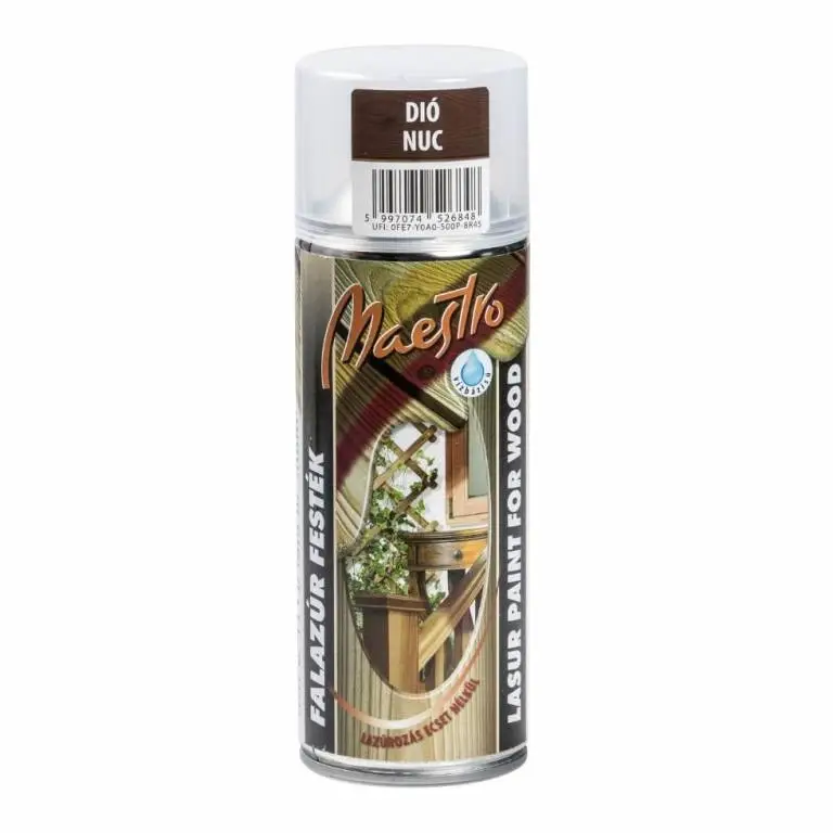 Maestro vízbázisú falazúr aeroszol dió 400 ml praktikus megoldás, ha gyorsan, egyenletesen és esztétikusan szeretnéd kezelni a fa felületeket. A dió árnyalat természetes, meleg tónust ad, miközben kiemeli a fa erezetét. Aeroszolos kiszerelésének köszönhetően kényelmesen használható kisebb felületeken, javításoknál vagy nehezebben hozzáférhető részeken is.